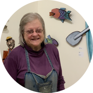 Kent- Robin is a well known and noted folk artist. Robin is best known for her three-dimensional art that draws admirers and collectors from across the region. Robin’s work is in the American Folk Art Museum in New York City. The gallery serves as Robin’s studio and she is present most days. Since I was a child, I loved getting lost in the process of moving abstract shapes around until seeing a form that speaks to me. My narrative contemporary folk art focuses on familiar, under appreciated, and possibly imagined moments.